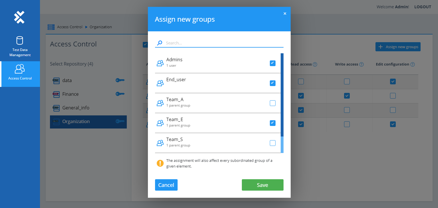 Die Administratorrechte des Test Data Service gelten für die zugewiesenen Gruppen und alle Untergruppen. |