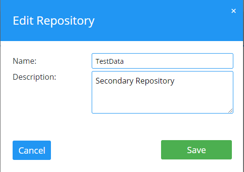 Bearbeiten Sie die verfügbaren Repository-Parameter. In diesem Dialog können Sie nur Parameter bearbeiten, die keine Datenmigration erfordern: Name und Description.
