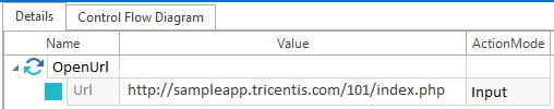 Tricentis Tosca erstellt automatisch einen neuen Testschritt mit dem XTestschrittwert Url. Geben Sie die URL der Tricentis Tosca Sample Application in die Spalte Value ein und setzen Sie den ActionMode auf Input.