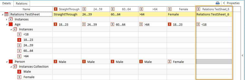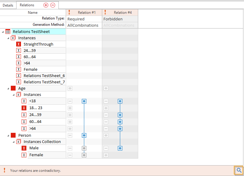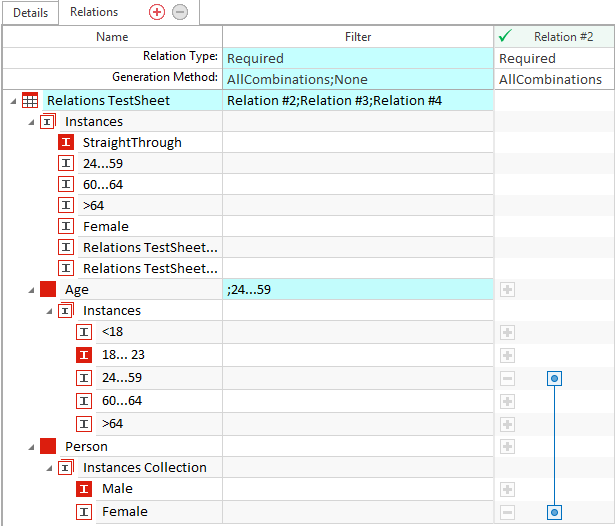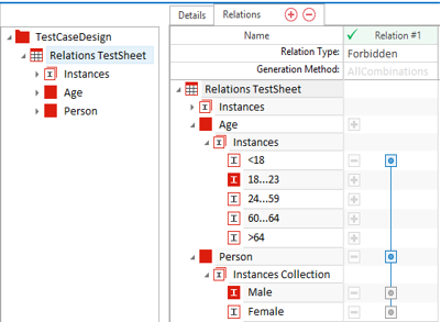 Sie definieren Relationen auf der Ebene TestCase-Design TestSheet. Diese Relationen werden berücksichtigt, wenn Sie Instanzen mit der Kombinatorik Linear expansion [Relations] erzeugen und kombinieren. Wie bei der normalen linearen Expansion müssen Sie einen StraightThrough-Pfad definieren.