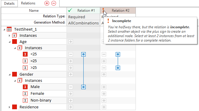 Mit Hilfe von Relationen können Sie projektspezifische Abhängigkeiten festlegen. Diese Abhängigkeiten helfen Ihnen, Instanzkombinationen so anzupassen, dass sie Ihren Business-Anforderungen entsprechen. Tricentis Tosca überprüft automatisch die Konsistenz der von Ihnen erstellten Relationen.