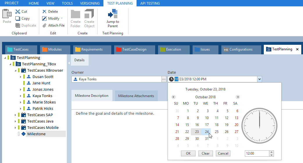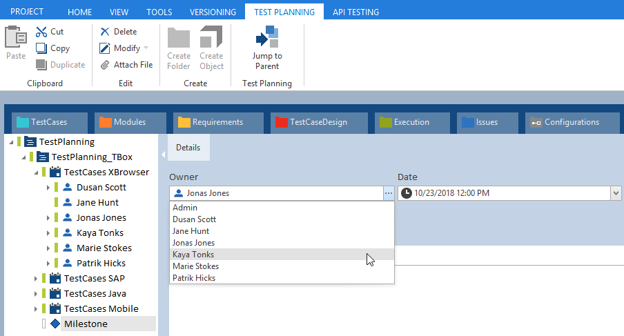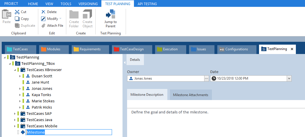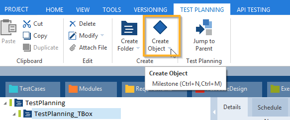 Create Object, oder klicken Sie mit der rechten Maustaste auf den Ordner TestPlanning und wählen Sie Create Milestone.