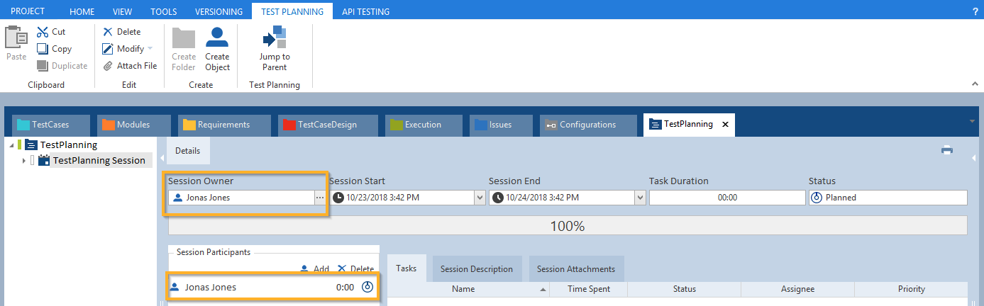 Die Session-Detail-Ansicht wird im Bereich Tricentis Tosca TestPlanning geöffnet.