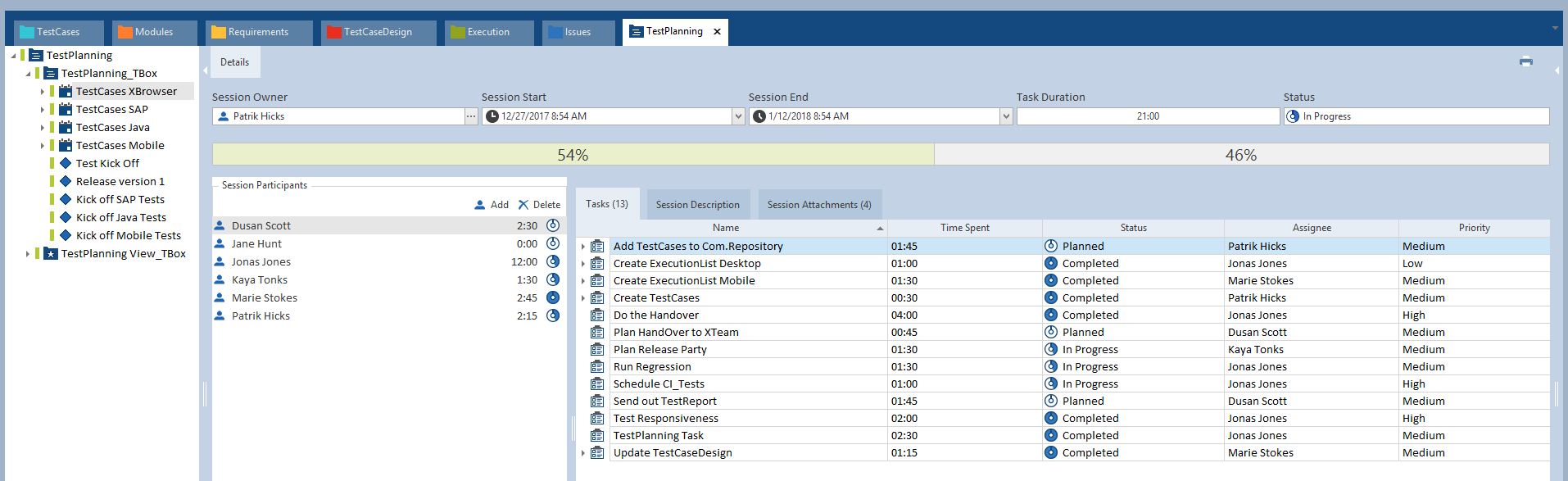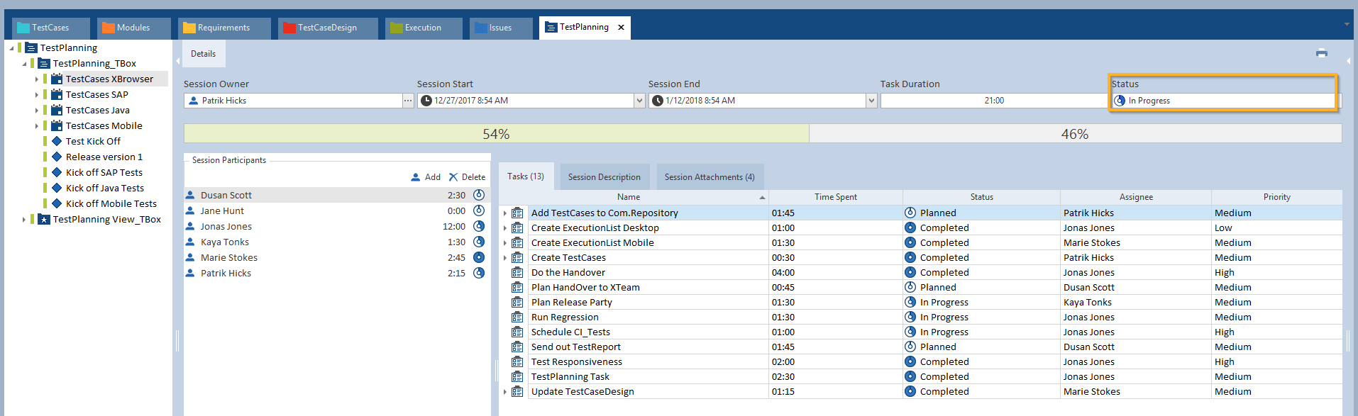 Die Detailansicht einer Tricentis Tosca TestPlanning-Session enthält alle relevanten Details der Session. Sie können die Session-Teilnehmer und ihre zugewiesenen Aufgaben ansehen. Mit der Session-Detailansicht erhalten Sie eine Übersicht über den Fortschritt der Session.