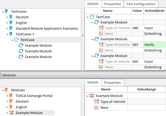 Ein Bildschirm oder sich wiederholende Elemente werden nur einmal als Modul aufgezeichnet. Dieses Modul kann beliebig oft in Testfällen mit beliebigen Daten wieder verwendet werden.