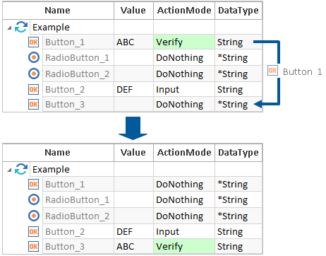 Eine Übertragung von Werten hat zur Folge, dass die Werte vom Quell-Testschrittwert in den Ziel-Testschrittwert kopiert werden.