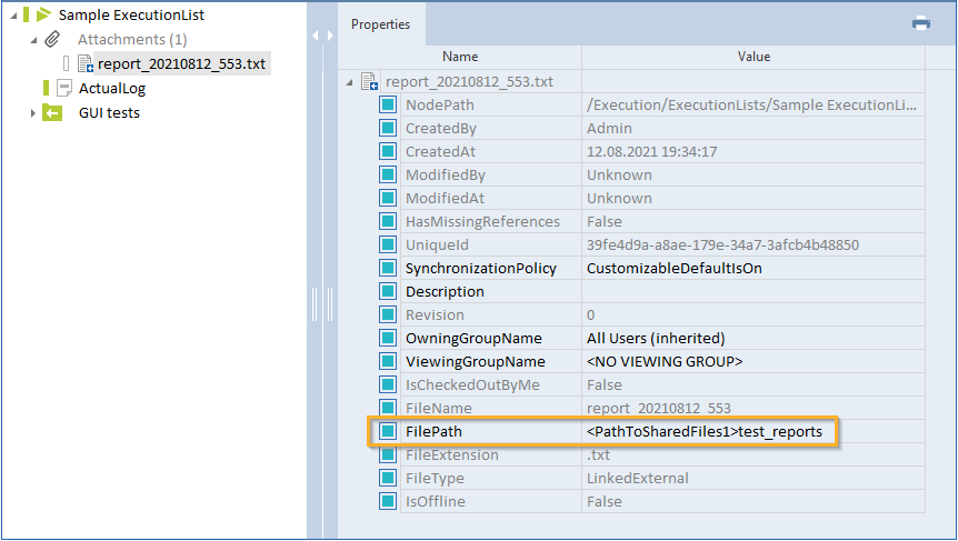 Wenn Tester 1 einen Dateiverweis auf J:\FileExchange\SharedFiles\test_reports\report_20210812_553.txt erstellt, sieht der Dateipfad im Tosca Commander wie folgt aus: