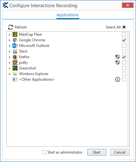 Wählen Sie die Applikationen, die Sie aufzeichnen möchten. Um Interaktionen in Applikationen aufzuzeichnen, die Administratorrechte erfordern, aktivieren Sie die Option Start as Administrator.