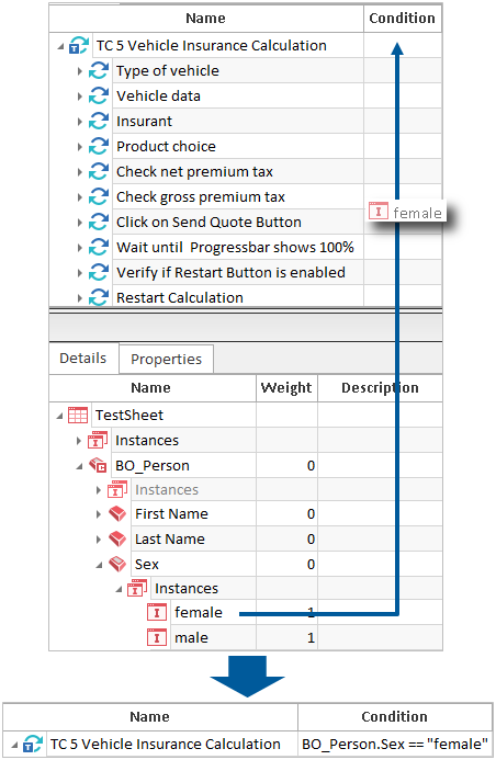 Die Testfall-Vorlage muss mit dem TestSheet oder der Klasse, in dem sich das Objekt befindet, verbunden sein. Es können Attribute und Instanzen als Bedingung zugewiesen werden. Die Drop-Operation muss in der Spalte Bedingung des jeweiligen Objektes erfolgen.