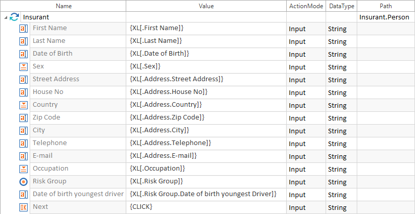 Es soll der Vorname des Kunden in die Testfall-Vorlage übernommen werden. Im TestCase-Design ist ein strukturierter Aufbau der Testdaten vorhanden. Für die Verknüpfung mit dem Attribut Vorname wird die Syntax um die Strukturebene Person erweitert. Die Trennung der Strukturebenen erfolgt über einen Punkt. Die Syntax für die Verknüpfung lautet {XL[Person.Vorname]}.