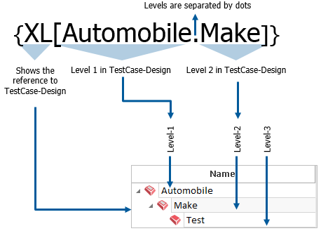Die Verknüpfung von Testschritten mit den Testdaten in der Vorlage erfolgt im Tosca Commander über die Eingabe von Attributnamen. Strukturierte Attribute der Testfalldarstellung können durch die Angabe der Attribute der jeweiligen Ebenen verknüpft werden. Die Attribute werden durch einen Punkt getrennt angegeben.