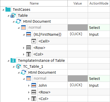 In diesem Beispiel werden Vornamen aus einer Tabelle in Form einer XL-Verknüpfung in der Testfall-Vorlage angegeben. Der Pfad zu den Testdaten wird in der Spalte Name der Testfall-Vorlage Tabelle eingegeben. Die Syntax für die Verknüpfung lautet {XL[Vorname]}. Wenn die Testfall-Vorlage instanziiert wird, werden die Vornamen aus der Tabelle in der Vorlagen-Instanz angezeigt (siehe Kapitel " Vorlagen-Instanzen erstellen").