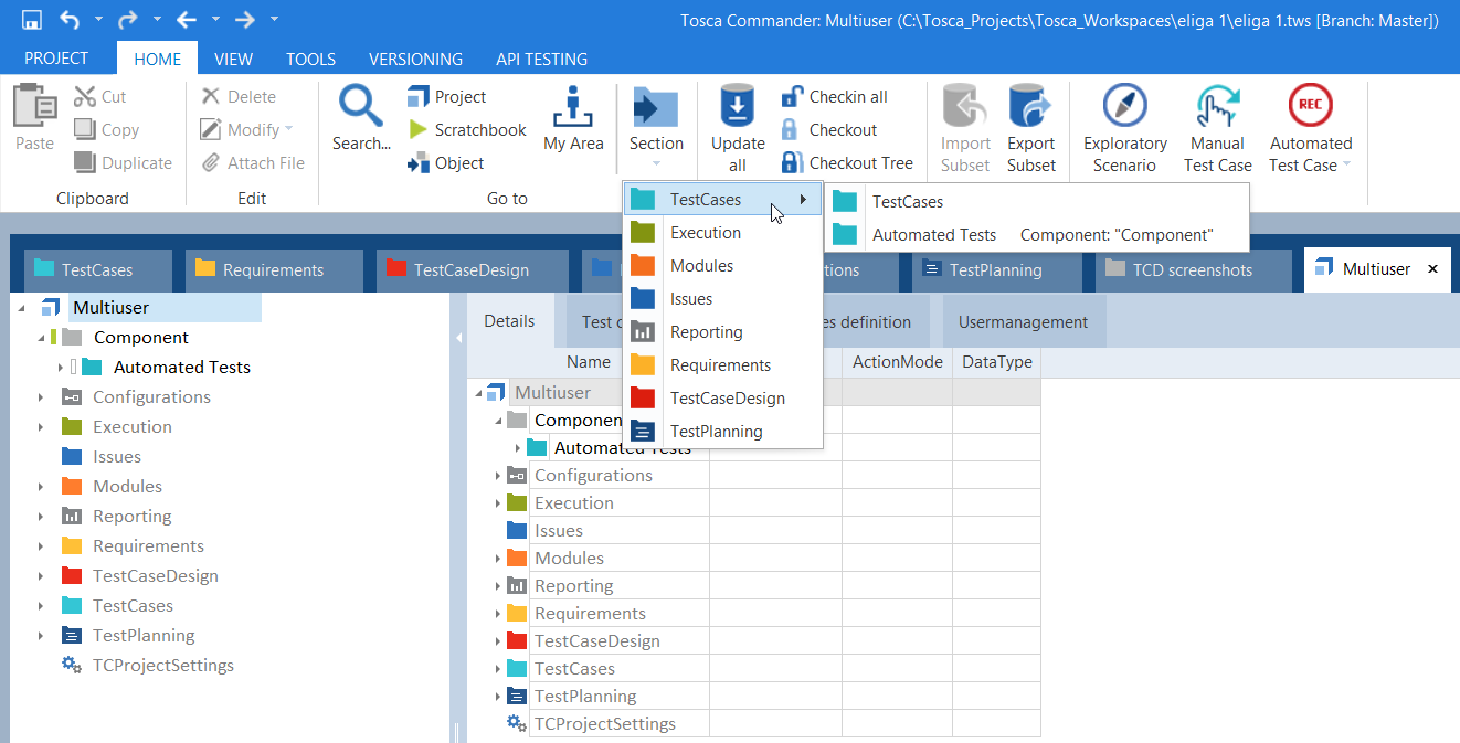 Komponenten-Ordner bieten Ihnen zusätzliche Flexibilität und erlauben Ihnen, Ihre Tests zu strukturieren. Innerhalb von Komponenten-Ordnern können Sie separate Unterordner für Ausführung, Module, Testfälle