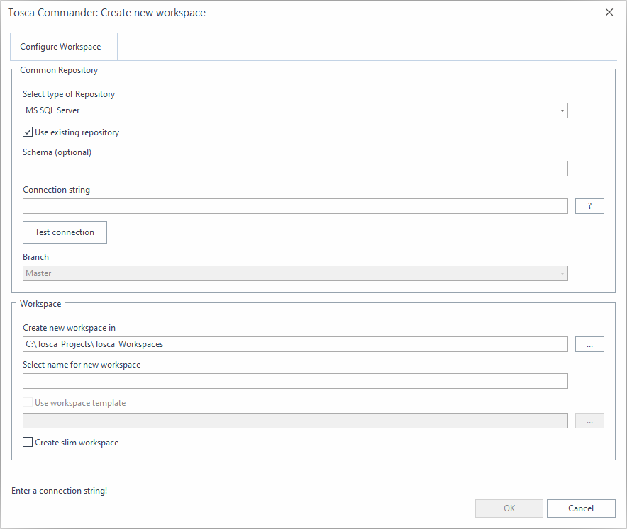 2. Nach einer Standardinstallation erstellt Tricentis Tosca neue Arbeitsbereiche im Standardverzeichnis C:\Tosca_Projects\Tosca_Workspaces. Sie können im Feld Create new workspace in ein anderes Verzeichnis angeben.