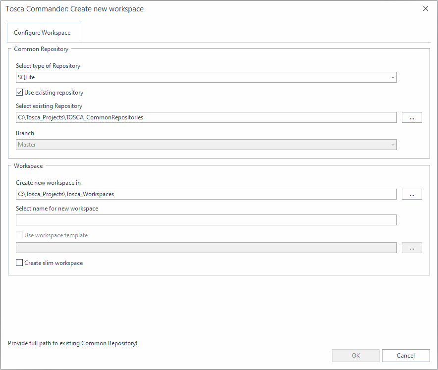 Wählen Sie im nachfolgenden Fenster Tosca Commander: Create new workspace SQLite aus dem Aufklappmenü Select type of Repository.