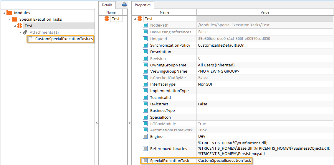 SpecialExecutionTasks sind spezielle Modul-Definitionen, mit denen bestimmte Operationen durchgeführt werden. Sie können SpecialExecutionTasks in Form von .cs-Dateien in einem Modul einbetten oder referenzieren Das Einbetten von Dateien wird in Kapitel " Dateien einbetten" detaillierter beschrieben.