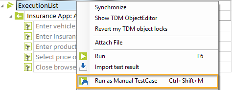 Klicken Sie dazu mit der rechten Maustaste auf das entsprechende Objekt und wählen Sie im Kontextmenü die Option Run as Manual TestCase.