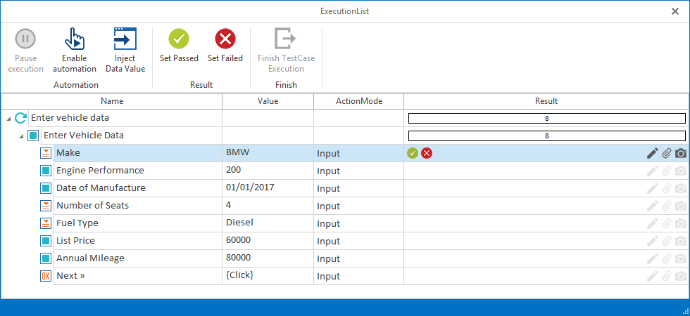 Verfügbar in der Menüleiste und in der Spalte Result. Setzen Sie einen Testschritt oder Testschrittwert auf Fehlgeschlagen. Alternativ können Sie auch Strg + Eingabetaste drücken. |