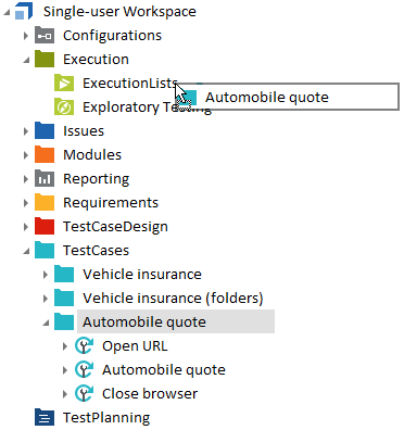 Die schnellste Option, eine Ausführungsliste zu erstellen, ist die, einen Testfall oder Testfallordner auf das