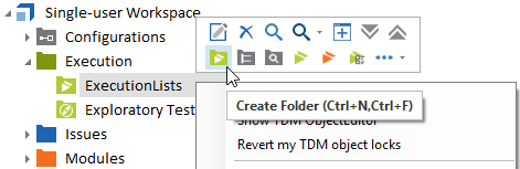 Um einen neuen Ausführungslisten-Ordner innerhalb des Execution-Ordners zu erstellen, klicken Sie mit der rechten Maustaste auf den Execution-Ordner und wählen Sie in der Minisymbolleiste die Option Create ExecutionLists Folder.