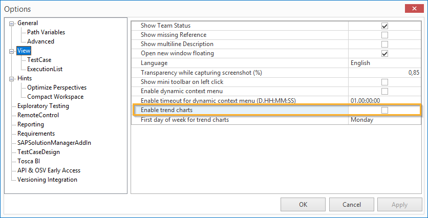 Um Trenddiagramme zu aktivieren, gehen Sie zu Project->Options->View und aktivieren Sie das Kontrollkästchen Enable trend charts.