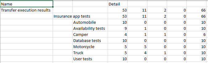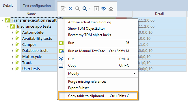 Die Spalte Detail im Tosca Commander enthält die Ergebnisse Ihrer Ausführungsliste als Zahlenwerte. Sie können diese Werte an Microsoft® Excel übertragen, sodass Sie diese Daten mit Drittsoftware weiterverarbeiten und analysieren können.