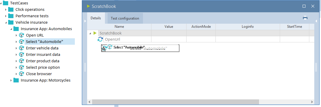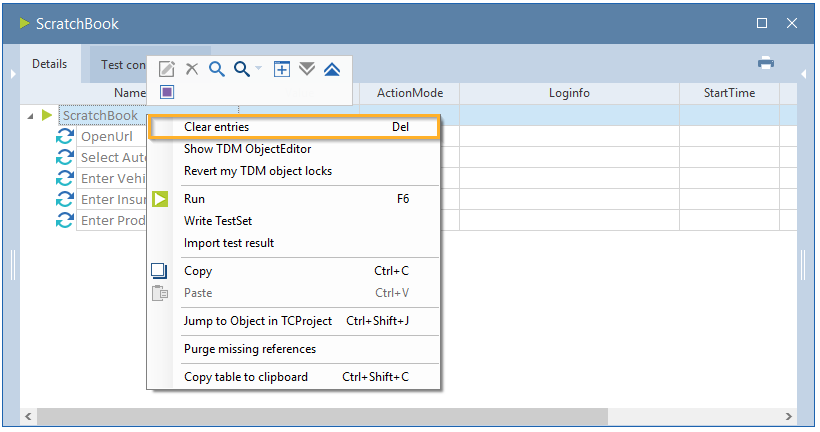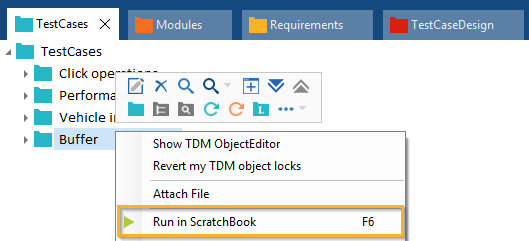 Mit dem ScratchBook können Sie Testläufe Ihrer Testfälle durchführen. Sie können folgende Objekte kombinieren und ausführen: einzelne Testschritte, Testfälle oder Testfallordner. Dies ist besonders nützlich, wenn Sie einen neuen Testfall erstellen oder Elemente eines fehlerhaften Testfalles untersuchen wollen.