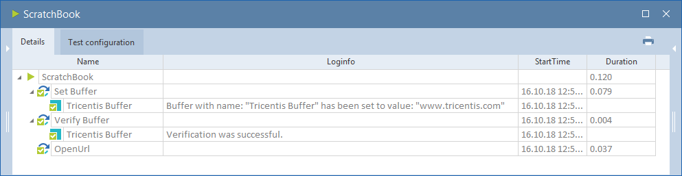 Sobald die Ausführung abgeschlossen ist, zeigt die Loginfo-Spalte im ScratchBook die Ausführungsergebnisse aller Testschritte an.