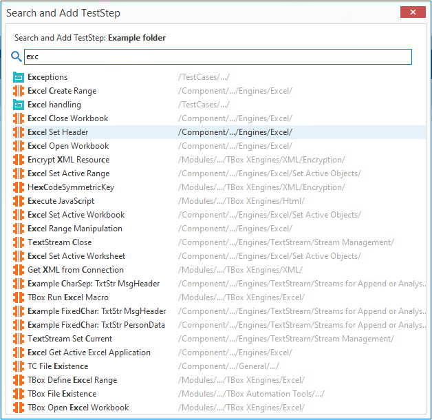 Mit der Tosca Fuzzy Search können Sie nach Modulen, XModulen und wiederverwendbaren Testschritt-Blöcken suchen, um neue Testschritte zu erstellen.