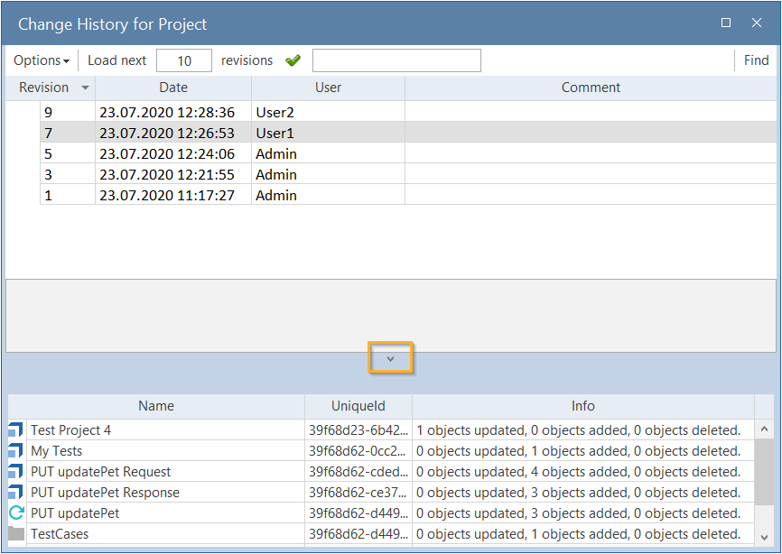 Wenn Sie auf eine Revision in der Liste klicken, lädt Tosca alle geänderten Clusterobjekte im unteren Bereich des Fensters. Das kann einige Zeit dauern. Um Wartezeiten zu vermeiden, empfiehlt Tricentis, das Fenster anzupassen und diesen Teil auszublenden, bevor Sie Revisionen zusammenfassen.