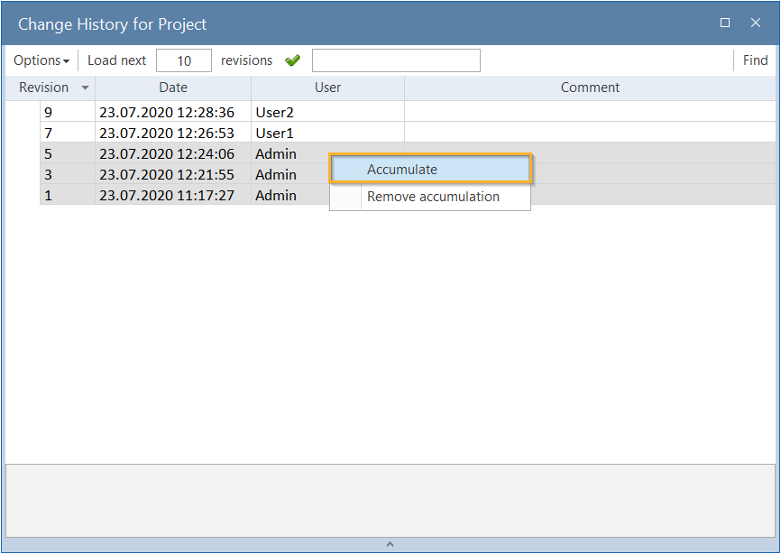 Um eine kumulierte Revision zu entfernen, klicken Sie mit der rechten Maustaste darauf und wählen Sie im Kontextmenü Remove accumulation.
