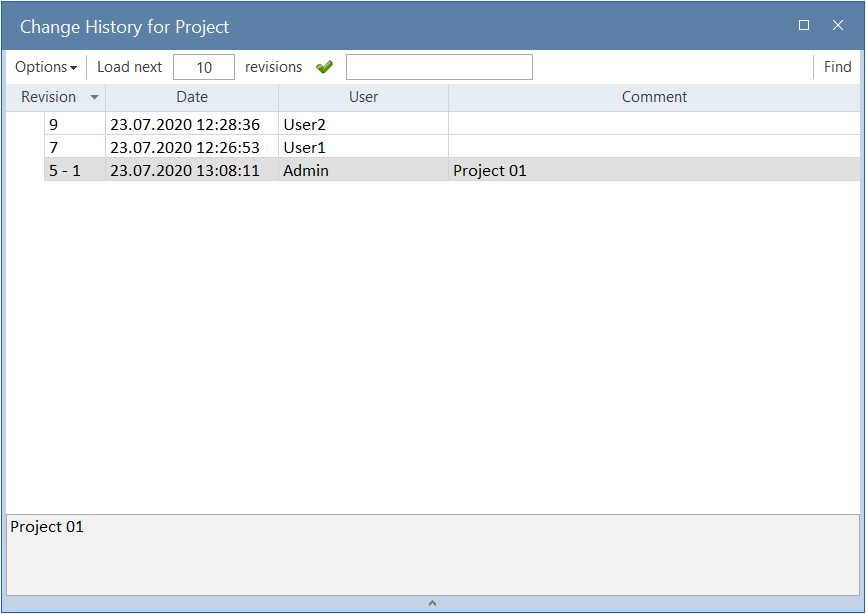 Standardmäßig werden in der Projekthistorie alle Revisionen vor der aktuellen Arbeitsbereichsrevision angezeigt. Wenn Sie alle Revisionen einschließlich Revisionen, die höher sind als die aktuelle Arbeitsbereichsrevision, anzeigen möchten, klicken Sie im Menü Home auf Update all, bevor Sie die Projekthistorie anzeigen.