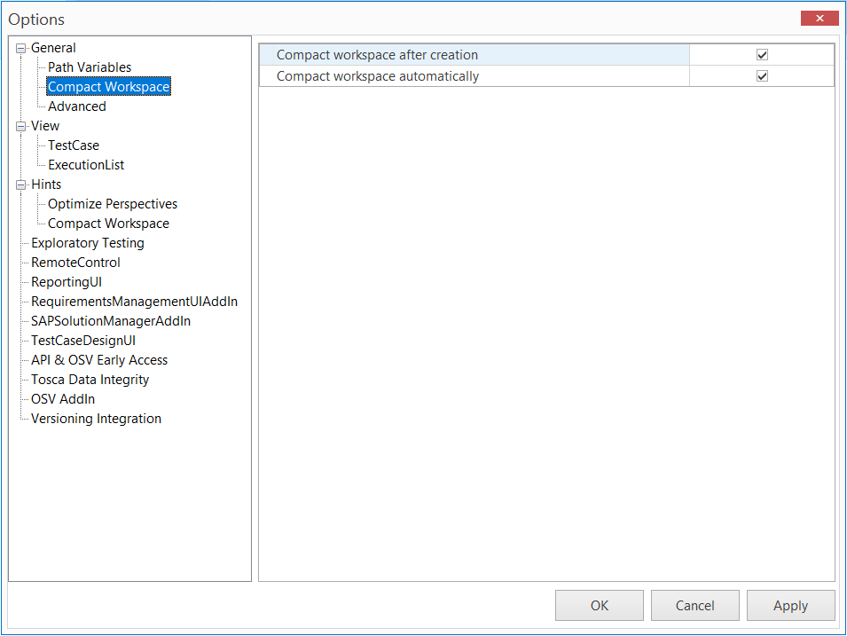 Wenn Sie diese Option aktivieren, komprimiert der Tosca Commander neu erstellte Arbeitsbereiche (siehe Kapitel "Compact Workspace:"). Sie können auch die automatische Komprimierung aktivieren (siehe " Compact workspace automatically"). |