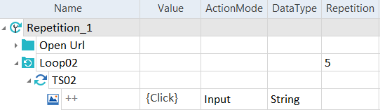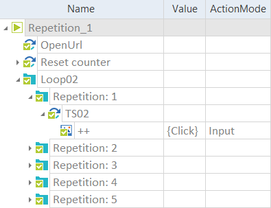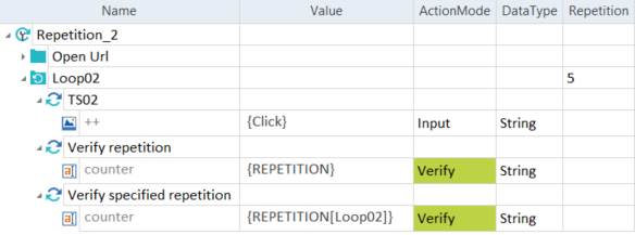 Verwenden Sie den Ausdruck {REPETITION} oder {REPETITION[Name der Wiederholung]} in der Spalte Value, um die aktuelle Anzahl der für den übergeordneten oder einen bestimmten Loop-Ordner eingestellten Wiederholungen zu überprüfen.