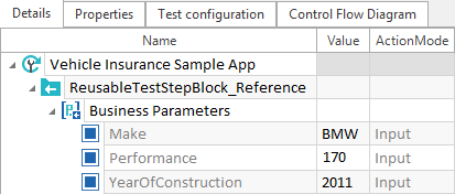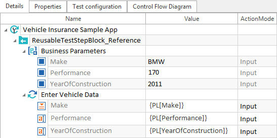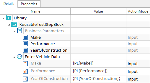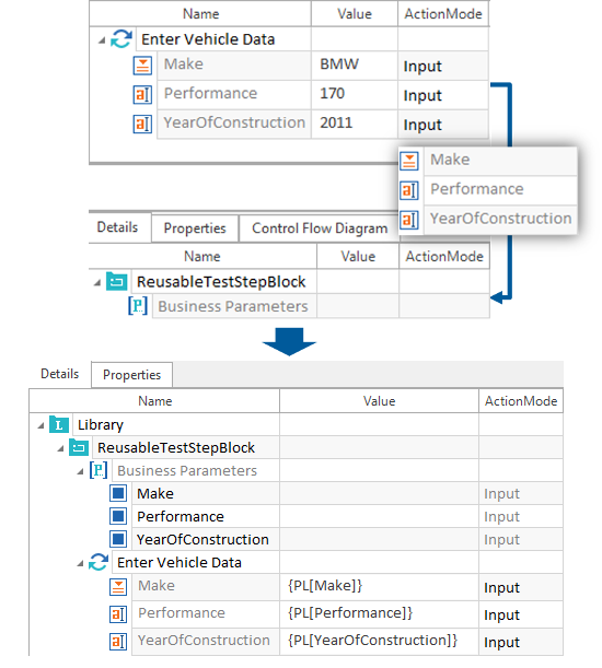Wiederverwendbare Testschrittblöcke sind abgeschlossene Objekte und können nur über ihre Businessparameter-Referenz Daten von außen übernehmen.