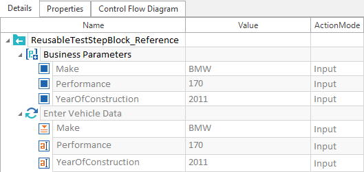 Daher kann der referenzierte wiederverwendbare Testschrittblock nur in seinen Businessparametern-Referenzen einen Parameterlink auf die Businessparameter des übergeordneten Testschrittblocks besitzen, nicht aber in seinen Testschrittwerten.