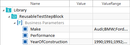 Klicken Sie mit der rechten Maustaste auf einen wiederverwendbaren Testschritt-Block, und wählen Sie aus dem Kontextmenü die Option Create Business Parameter Container. In diesem neu erstellten Businessparameter-Container werden alle Businessparameter definiert.
