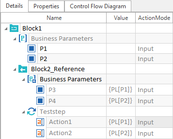 Die Businessparameter-Referenzen P3 und P4 haben Parameter-Links auf die Businessparameter P1 und P2 des übergeordneten wiederverwendbaren Testschrittwert-Block als Wert.