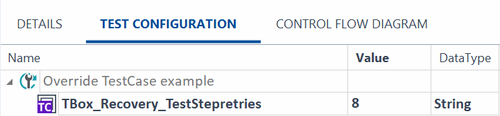 In diesem Beispiel verwenden Sie einen TCP innerhalb eines Testfalls, um die Einstellung TBox -> Recovery -> TestCase retries zu überschreiben. Erstellen Sie dazu einen neuen TCP für den Testfall OverrideTestCaseExample namens TBox_Recovery_TestCaseretries mit dem Wert 8.