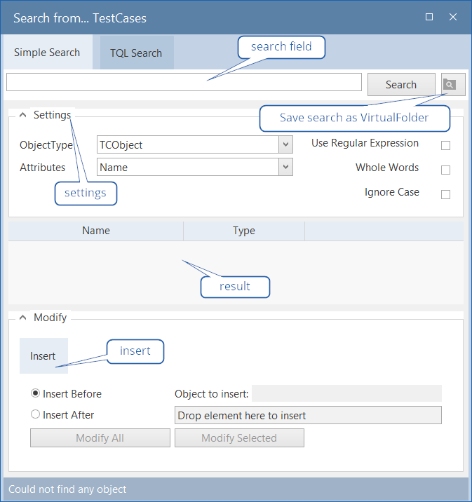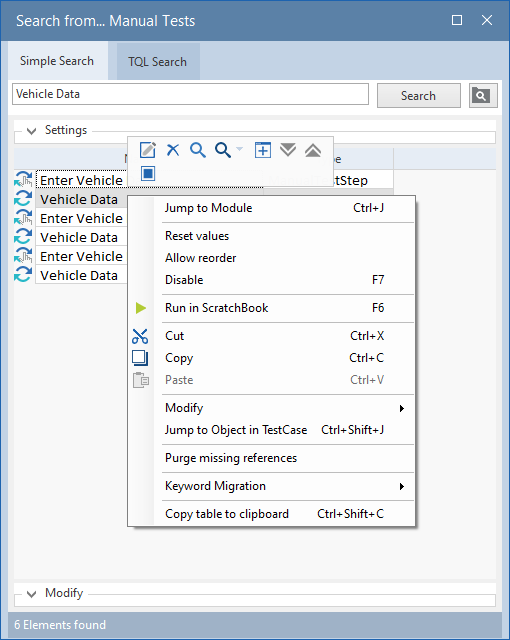 Alle Objekte, die einem Testfall zugeordnet werden können, sind im Suchergebnis über Modifizieren veränderbar.