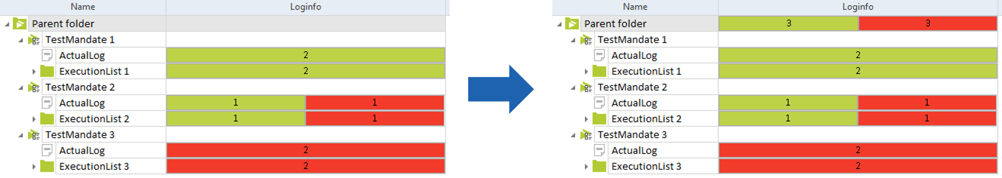 Übergeordneter Ordner mit Testaufträgen: ohne kumulierte Ergebnisse und mit kumulierten Ergebnissen