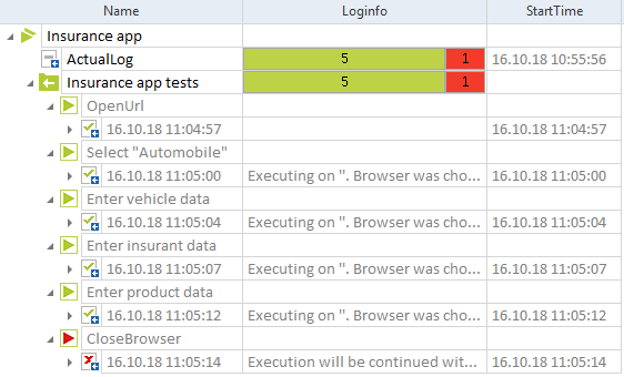 Ausführungsliste Insurance app nach Ausführung des verknüpften Testauftrages