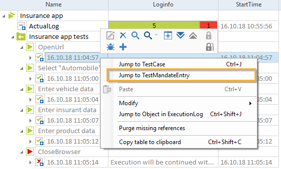 Klicken Sie dazu mit der rechten Maustaste auf den Testobjekt-Ausführungseintrag und wählen Sie im Kontextmenü die Option Jump to TestMandateEntry.
