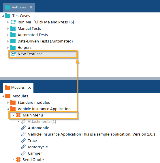 Um einen Testschritt für einen vorhandenen Testfall zu erstellen, ziehen Sie ein Modul auf den Testfall.