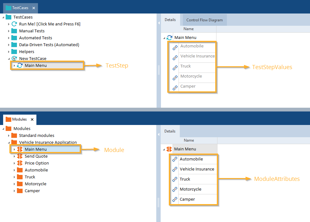 Für die Erstellung eines Testschrittes müssen Sie einem Testfall ein Modul zuweisen. Tricentis Tosca erstellt die Testschritte auf Basis der Modulattribute.