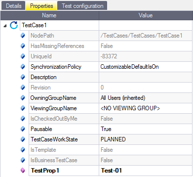 Eine benutzerdefinierte Testfall-Eigenschaft hat den Namen TestProp1. Gesucht werden alle Testfälle, bei denen diese Eigenschaft den Wert Test-01 hat. Die Groß-/Kleinschreibung soll dabei ignoriert werden.