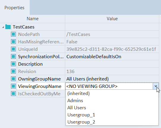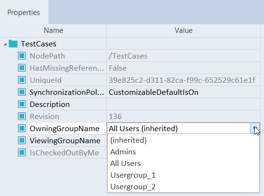 Wählen Sie in der Spalte Value der Eigenschaft OwningGroupName die Benutzergruppe aus dem Aufklappmenü aus.