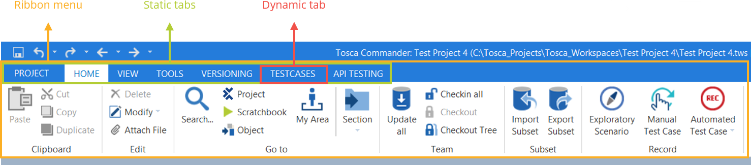 Das Menüband des Tosca Commander besteht aus mehreren Menü-Reitern: