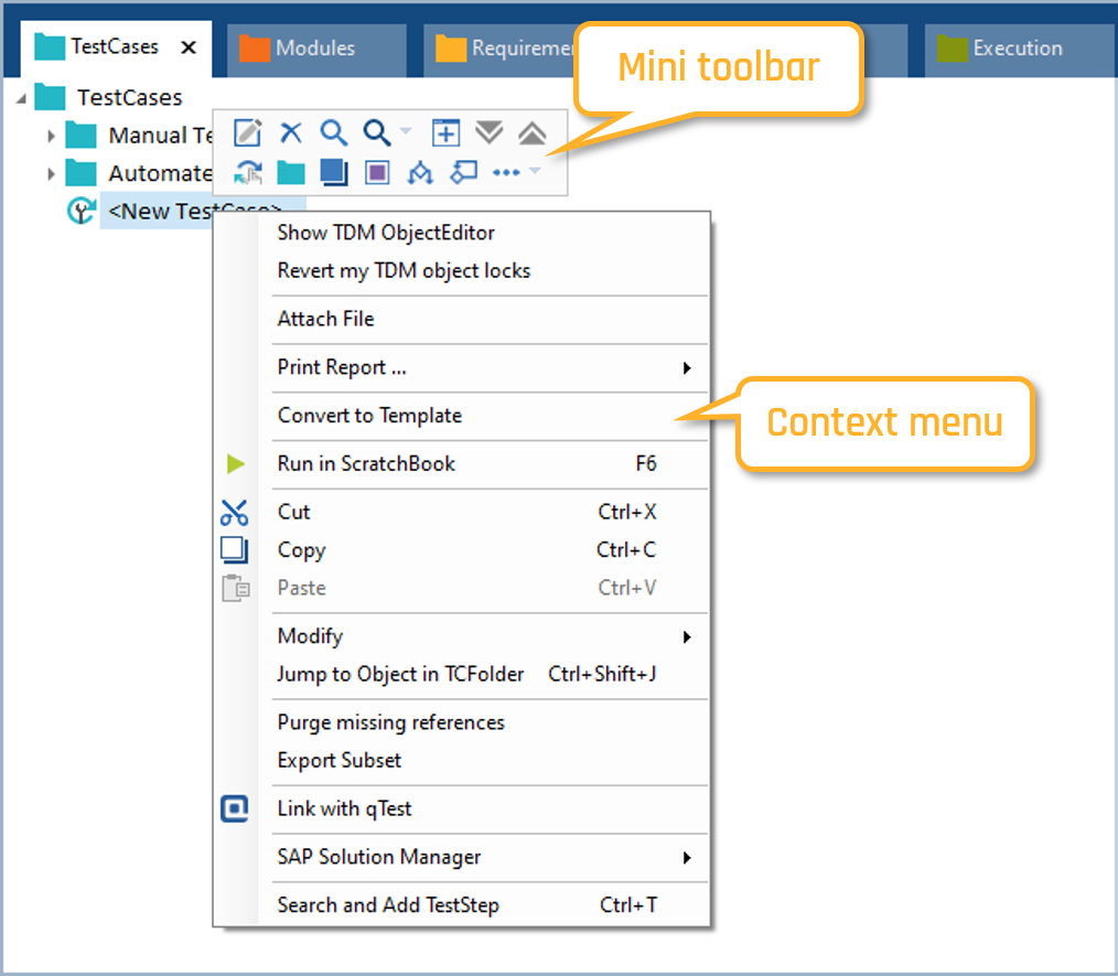 Kontextmenüs im Tosca Commander