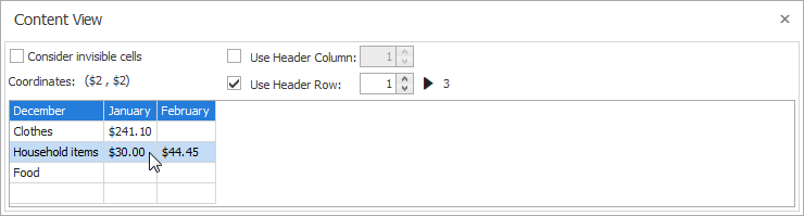 Standardmäßig ist für die Kopfzeile der Wert 1 ausgewählt. Bewegen Sie die Maus über eine Zelle, um die Koordinaten der Zelle anzuzeigen. Durch einen Klick auf eine Zelle wird die jeweilige Zeile oder Spalte als Kopfzeile definiert.